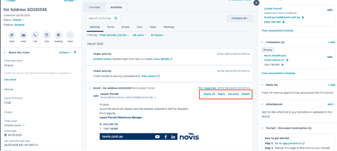 1. When an email requires a response from within Novis, the email MUST NOT be forwarded to an internal email address (team/shared inbox or personal email address). This causes the email to lose important metadata that enables HubSpot to track the email.